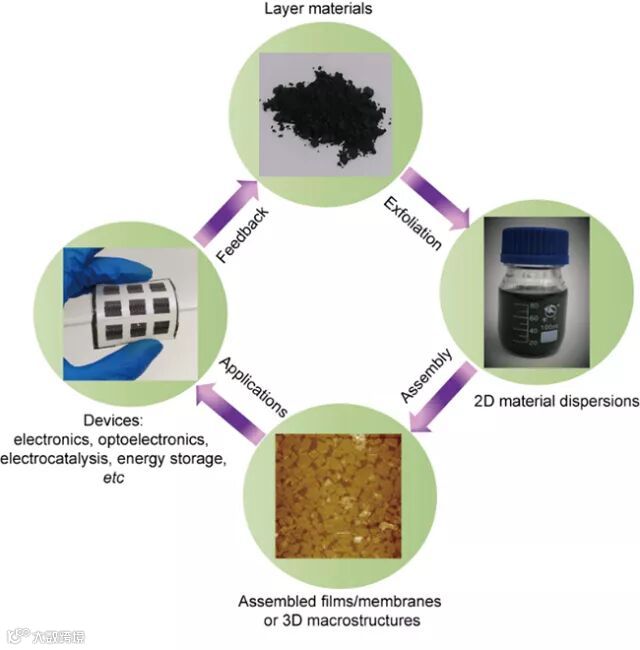 图1.二维材料分散液的制备、组装及其在各类器件中的应用