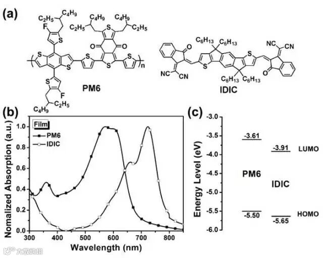图1. (a)聚合物给体和小分子受体的结构式,(b)吸收曲线,(c)能级示意图。