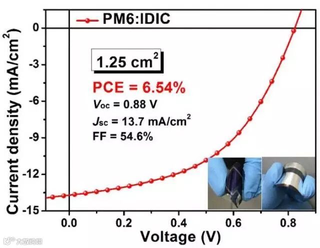 最近,苏州大学先进光电材料重点实验室的张茂杰教授用一种以氟取代噻吩基苯并二噻吩为给体单元、苯并二噻吩二酮为受体单元的二维共轭聚合物给体材料PM6做给体,非富勒烯IDIC做受体,不需要任何特殊处理的情况下简单方便的制备了对活性层厚度和器件面积不敏感的高效非富勒烯太阳能电池(能量转化效率11.9%),相关工作发表在Advanced Materials(IF = 19.791)上。