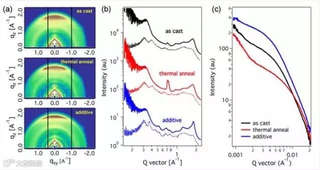 图4. PM6:IDIC的共混膜在不同处理条件下的GIWAXS和ReSOXS图。