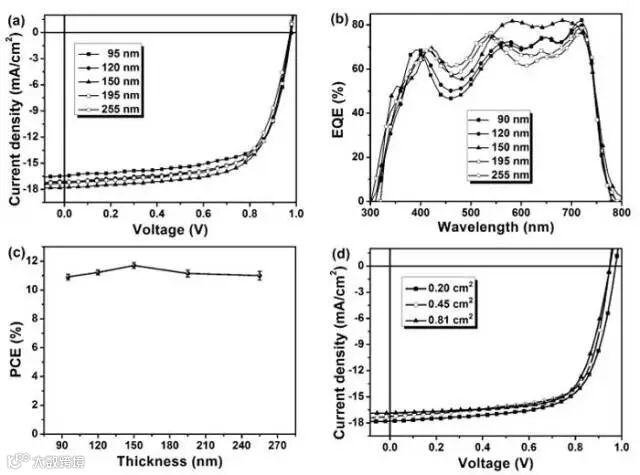 图2.(a)不同活性层膜厚时的电流-电压曲线;(b)外量子效率曲线;(c)器件效率与活性层膜厚的关系;(d)不同器件面积时的电流-电压曲线。
