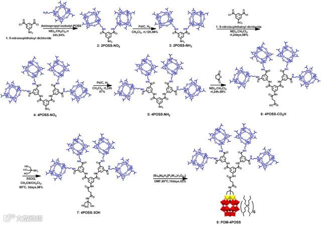 在实验方面,研究团队设计并合成了由一个多金属氧酸盐簇合物(POM)和四个多面体齐聚倍半硅氧烷簇合物(POSS)组成的POM-4POSS分子(见图1)。因连接链是刚性的平面树枝状的分子,POM-4POSS分子具有扇形形状(见图1)。