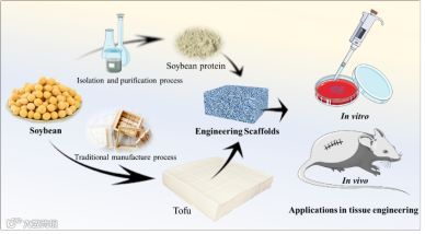 本文作者以传统豆腐制备工艺为基础,将豆腐开发成组织工程支架。研究表明,豆腐支架与化学交联大豆蛋白支架具有相似的理化性能;细胞实验和动物实验表明,豆腐支架具有良好的生物相容性,适合细胞的生长和植入体内后小血管的生成。