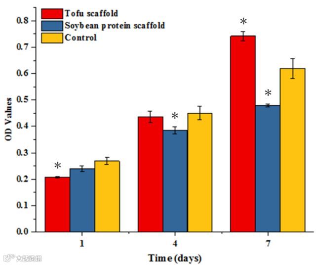 Figure 6. Proliferation of NIH 3T3 cells after 7 days culture with the leaching solution of soybean protein and tofu scaffolds. *p < 0.05 (compared with the control at the same time), Mean ± SD, n = 3.