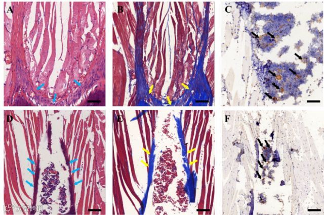 Figure 8. The results of histology evaluation implanting tofu scaffolds (A, B and C) and soybean protein scaffolds (D, E and F) after 7 days. (A & D): HE stained section of the scaffold with surrounding tissues. Tofu scaffolds part was indicated by blue arrows and good biological integration with the surrounding tissues of implantation site was observed, which represented good biocompatibility of tofu scaffolds; (B & E): Masson staining displayed obvious collagen deposition in tofu scaffold part, indicated by yellow arrows; (C & F): CD31 staining was carried out to evaluate the neovascularization. The brown spots, indicated by black arrows, represented the angiogenesis in tofu scaffolds. Many minute vessels had grown out. Scale bar = 100 μm.