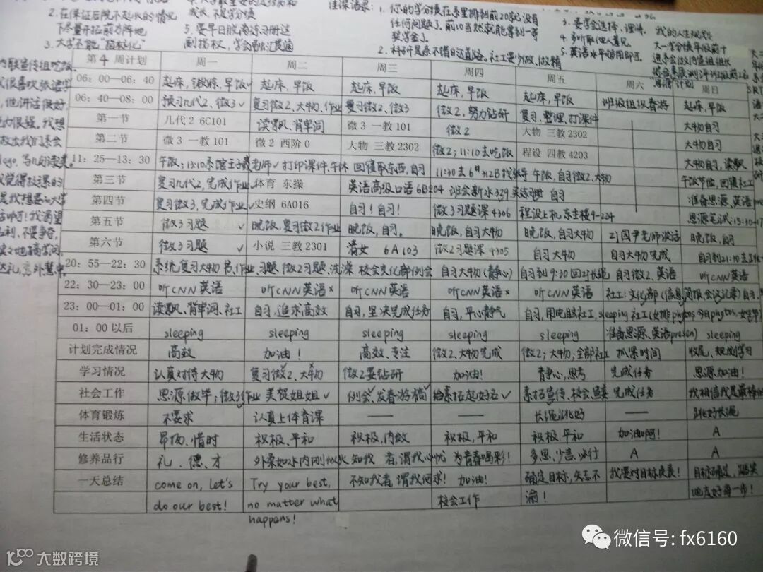 看看清华大学学生马冬晗大学时的计划表,就知道孩子的努力程度够不够了:每天6点起床,6:40开始自习,白天除了上课和吃饭,其余大部分时间用来自习、听英语,凌晨1点才上床睡觉连周末也是如此。