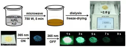 基于以上思路,课题组采用微波辐照加热处理乙醇胺与磷酸水溶液的方法,获得了具有超长寿命(1.46秒,肉眼可见超过10秒)室温磷光发射的碳点。进一步研究表明,碳点的无定形结构、存在可产生颗粒内氢键基团及N, P元素掺杂可能是该碳点产生超长寿命室温磷光的原因。这一工作实现了长寿命发光性能碳点的高效(转化率约70%)、便捷(5分钟微波加热)、克级(2.8g)制备(如图3)。相关研究结果近期发表在德国《应用化学》杂志上(Angew. Chem. Int. Ed. 2018, DOI: 10.1002/anie.201802441; https://onlinelibrary.wiley.com/doi/abs/10.1002/anie.201802441)。