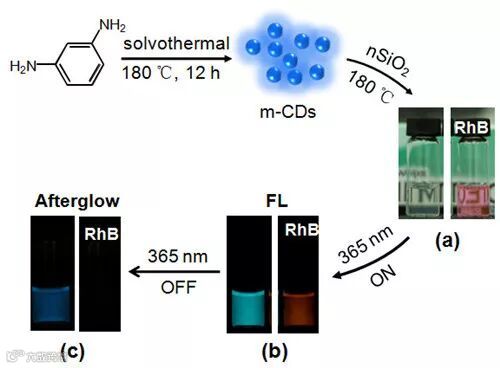 图2 碳点的制备及其与nSiO2共价键结合实现可分散在水中的长寿命发光(罗丹明B(RhB)水溶液发光特性作为对照)