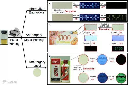 图4 具有热响应产生磷光的碳点油墨及其在信息保护与防伪领域的潜在应用(通过电吹风加热(约300 ℃,30秒)实现加密信息的解密与真伪商品/有价证券等的鉴别)