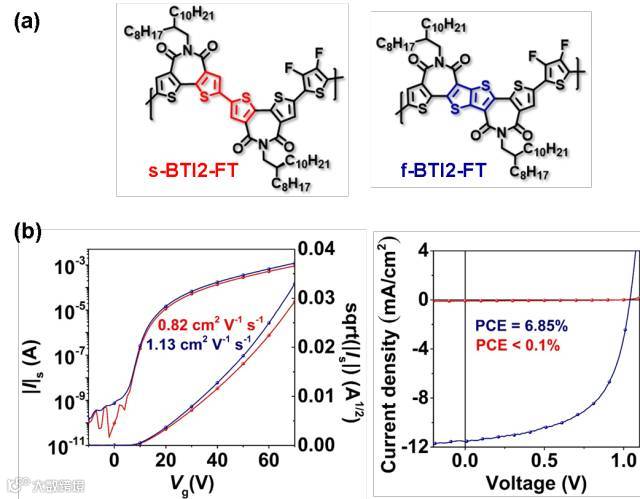 图1. (a)双噻吩酰亚胺受体材料的化学结构;(b)晶体管器件性能(左)和 全聚物太阳能电池器件性能(右)