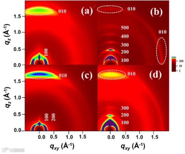 图 2. 聚合物半导体薄膜的二维掠入式宽角X衍射图。