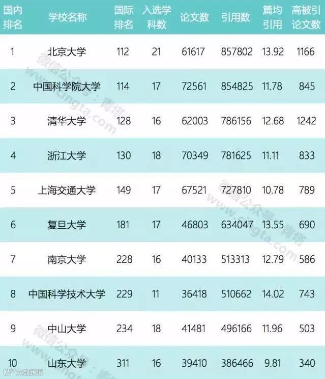2017年11月ESI中国内地高校TOP100中,北京大学位居国内高校首位,国际排名112位,入选学科数也达到21个。中国科学院大学国际排名114位,位居国内高校第二。清华大学国际排名128位,入选ESI前1%学科总数16个。浙江大学国际排名130位,入选ESI前1%学科总数18个。北京大学、中国科学院大学、清华大学、浙江大学、上海交通大学和复旦大学六所高校进入国际排名前200位。此外,南京大学、中国科学技术大学、中山大学和山东大学ESI综合排名也进入内地高校前十位。