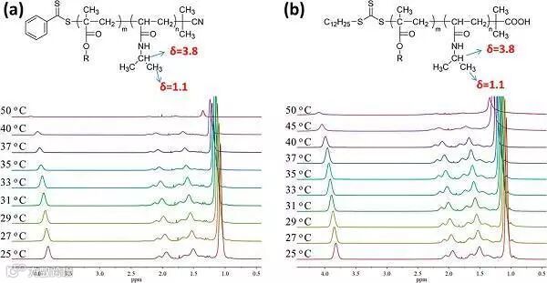 图2 嵌段共聚物BC-CPDB和BC-DDTA的化学位移随温度的变化