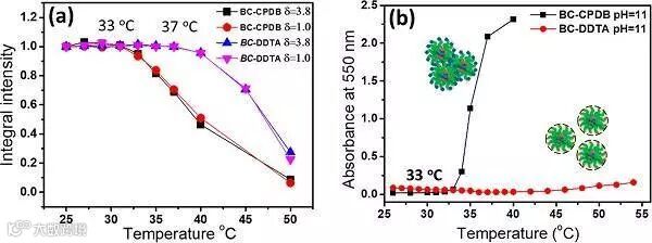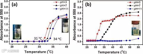 图1 嵌段共聚物在不同pH水溶液中的热响应性质