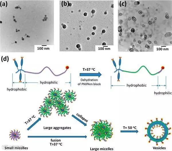 在这个工作中,作者设计了一种基于PNIPAm、含有羧基偶氮基团的双嵌段共聚物,由于含有带电荷的端基而具有的特殊的热响应行为。加热时,离子化的端基可以防止嵌段共聚物的相分离,导致浊点的消失。当胶束溶液在50℃下保存2h后,胶束溶液以带电荷端基稳定的大胶束为转化态,表现出从胶束到囊泡的形态转变。这种形态转变可归结于带电荷端基稳定和PNIPAm亲疏水平衡变化的共同作用结果。这个工作为后续刺激响应聚合物的设计提供了一种新的方法。