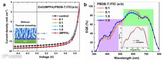 图2 非富勒烯体系的器件性能(a)及外量子效率(b)曲线
