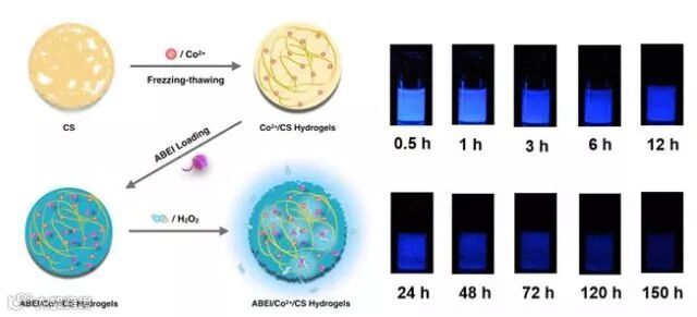 研究团队采用天然的壳聚糖、化学发光试剂N-(4-氨丁基)-N-乙基异鲁米诺(ABEI)和催化剂Co2+,制备了水凝胶。研究发现,99.8 % Co2+被固定在水凝胶骨架上,而89.5 % ABEI分散在水凝胶孔洞中。当加入氧化剂H2O2,其缓慢扩散进入水凝胶,被位于活性中心的催化剂Co2+分解产生活性自由基,接着与化学发光试剂反应产生化学发光。由于Co2+的螯合和异相化作用增强了其催化活性和稳定性,且具有微米/纳米孔洞和高粘度的水凝胶大大降低H2O2的扩散速度,从而产生了强而长的化学发光。