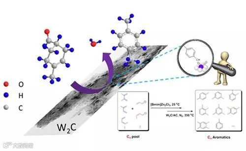 该团队首次报道了以碳化钨为催化剂,通过分子内氢转移,进而实现脱氢芳化和加氢脱氧的高度耦合反应。该过程中的碳化钨表面剪切式反应机理完全不同于传统贵金属催化过程,且碳原子在产物中可100%保留,主要副产物为水,便于PX产物的分离。此进展为探索从生物质资源出发制备芳香化学品提供了一条新思路。