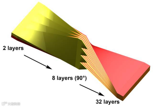 多层结构通过扭转层叠的微纳多层共挤技术制造。与立交叠层的方法相比,更易保证薄膜良好的平滑度。制备过程中,PMMA和PET通过两个挤出机挤出,并通过层叠器获得具有一定厚度比的PMMA / PET熔体双层结构。当通过层叠器时,双层熔体首先在宽度方向上分成4通道。4个通道的双层熔体沿挤出轴线方向扭曲90°并在宽度方向被切割前延展至一定宽度,从而形成2*4 = 8层的周期性结构。三个4通道层叠器串联连接,形成2*4^3 = 128层的多层异质结构。最后通过梯度膜厚层叠器将熔体按比例分割,比例值即六组中PMMA/PET的厚度比。最后通过挤出模头和成型装置形成最终的多层异质结构。实际厚度即所有层的厚度之和。
