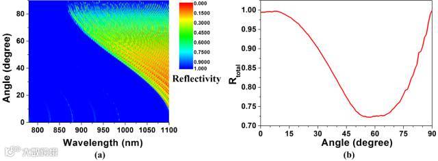 图 4 (a)基于入射角和波长通过模拟计算的设计结构的反射率;(b)近红外光谱(780-1100nm)的反射率对入射角的依赖性。
