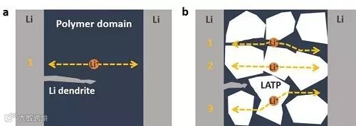 锂离子在聚合物固态电解质以及复合固态电解质的传输路径示意图