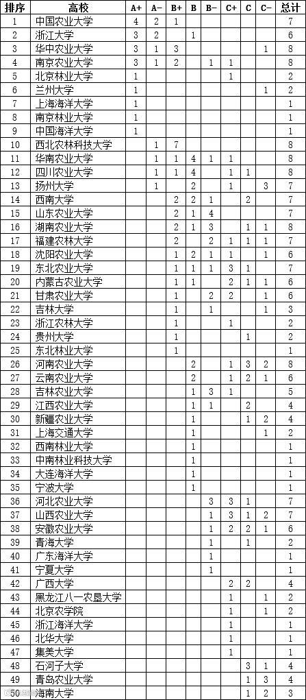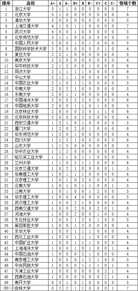 (一)排序方法:针对7个领域分别根据该领域内学科评估结果进行排序,首先以A+学科数量进行排序,A+学科数量相等,则参照A学科数量,依次类推。