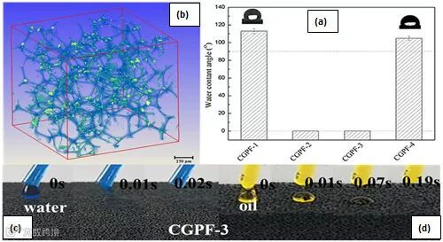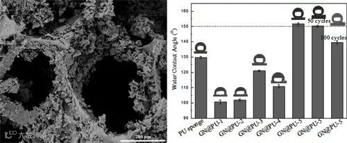 在上述工作基础上,通过改变工艺,将聚氨酯海绵依次涂覆纳米纤维素和石墨烯,通过调整纳米纤维素的量,可以获得不同表面浸润特性(疏水-超双亲-疏水)的聚氨酯海绵。研究表明,纳米纤维素晶须与石墨烯的协同作用构建了聚氨酯海绵特殊的超双亲表面性质。