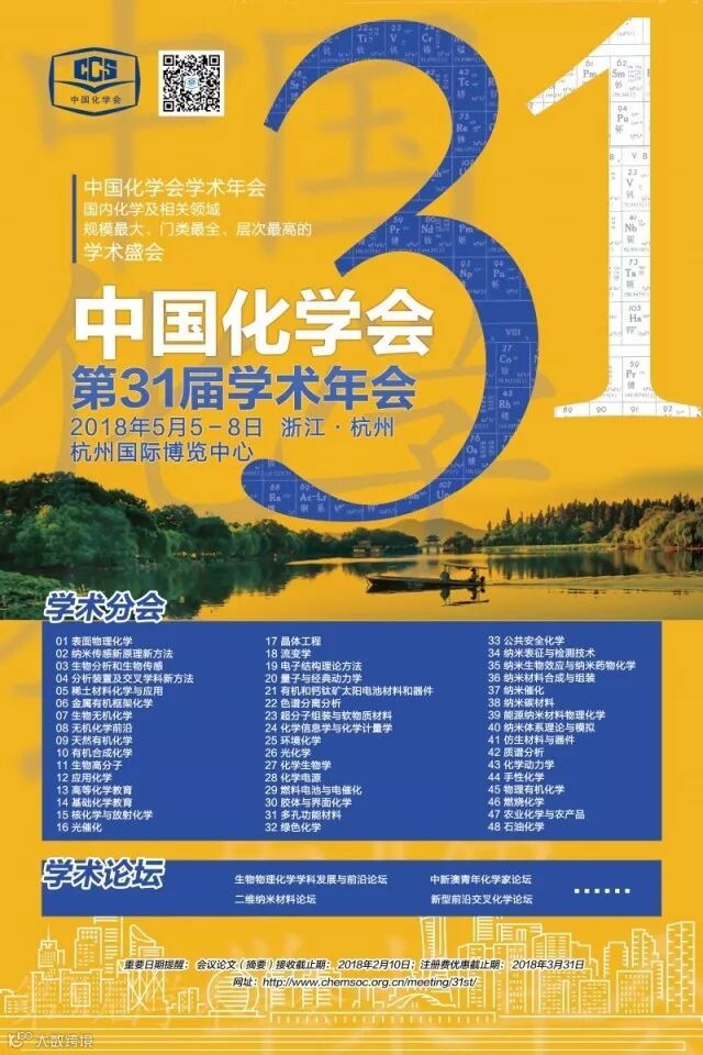 中国化学会第31届学术年会将于2018年5月5-8日在浙江省杭州国际博览中心举行。
