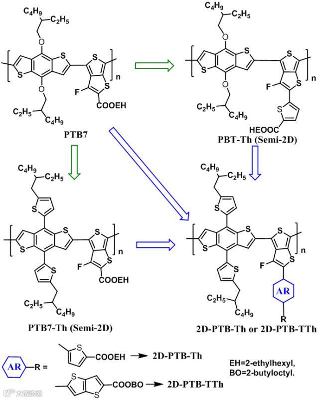 图1. 全二维共轭结构设计思路以及聚合物2D-PTB-Th和2D-PTB-TTh的化学结构式