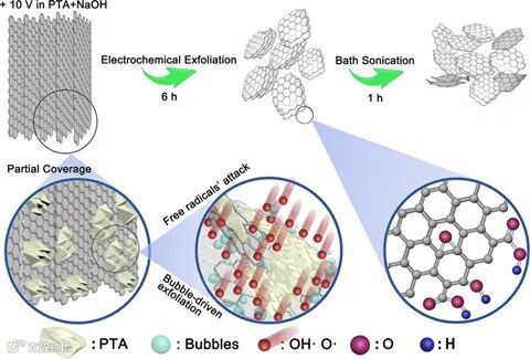 近期,学术期刊《Green Chemistry》在线刊发了中科院上海微系统所石墨烯粉体材料研究团队丁古巧、何朋等科研人员在水溶性石墨烯材料制备方面取得的重要进展:基于创新的电化学技术和超声辅助分散机制,在NaOH与PTA混合电解液体系中实现了少层高浓度水溶性石墨烯的制备。在这一体系中,研究人员通过控制电化学过程,使PTA析出并吸附于石墨电极,促进石墨充分氧化和逐层剥离,随后辅以超声处理进一步提高产率,实现了高产率(87.3 %)、高固含量(8.2 g/L)以及高稳定性(8个月以上)的少层微米尺寸水溶性石墨烯的制备,相对于已有研究报道具有明显优势。同时,由于电化学阳极分子吸附保护机制,实现了产物片层sp2 结构的保留,制备成膜后,经较低温度热还原便可获得较高的电导率(9517 S/m),应用潜力巨大。进一步的机理研究明确了不同于以往插层、氧化、膨胀、剥离的电化学机制,逐层剥离和深入氧化的电化学新机制克服了传统电化学方法剥离不完全导致的产物层数多、质量低、分散性差等问题。同时,进一步的研究确定了超声在不同环境、不同处理时间及不同前驱体条件下的效果,对于后续研究中的工艺改进具有重要指导意义。所制得的水溶性石墨烯极易成膜,在电热方面表现出低电压、高速升温和温度一致性好等优点,有望作为新型电热材料推广应用。