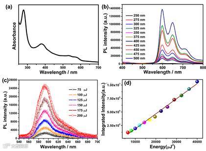 (图三 橙红色聚合物碳点的激发依赖性质和双光子性质)