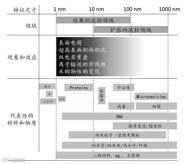 图2.纳流控领域关联物理现象与效应,以及相同尺度下代表性的材料和物质
