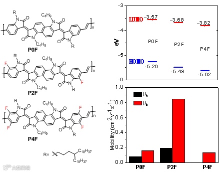 基于以上考虑,中国科学院长春应用化学研究所耿延候教授课题组设计并合成如下图所示的基于异靛蓝并[7,6-g]异靛蓝(DIID)的共轭聚合物(P0F,P2F和 P4F),向缺电子的平面刚性DIID单元中引入氟原子可以进一步降低前线轨道能级;与乙烯单元交替排列,可以提高共轭骨架的平面性和电子云的离域程度。