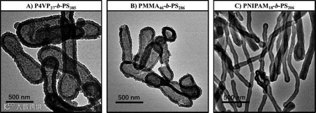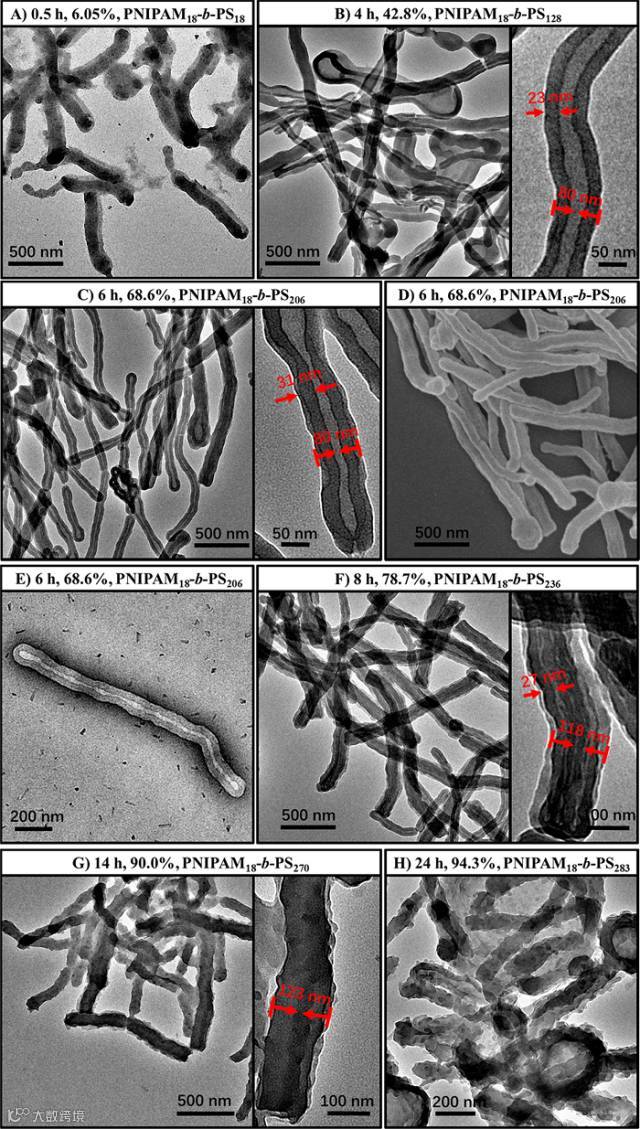 图4 通过RAFT分散聚合制备的一些列DBCP纳米管的TEM图