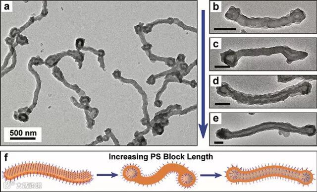 他们利用这种方法聚合苯乙烯(St)和CD的复合物制备PEG-b-PS组装体,通过调控PS的聚合度,制备了多种形貌的组装体,包括球形胶束、棒状胶束、片层、纳米管。在聚合过程中,他们观察到随着PS链的增长,带状片层逐渐转变形成纳米管。如图2所示,在转变的过程中,首先带状片层上形成小囊泡,较大概率分布在带状末端,形成一种哑铃状的中间体,随后小囊泡数量增加并逐渐融合得到纳米管。这种形貌转变不同于蠕虫状胶束-片层-囊泡的形貌转变,其可能的原因是CD/St的复合降低了PS的溶胀程度,限制了PS嵌段的移动能力,进而得到动力学控制的形貌。