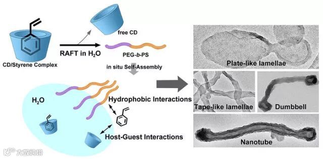 图1. 引入主客体作用实现PISA制备多种形貌组装体的示意图