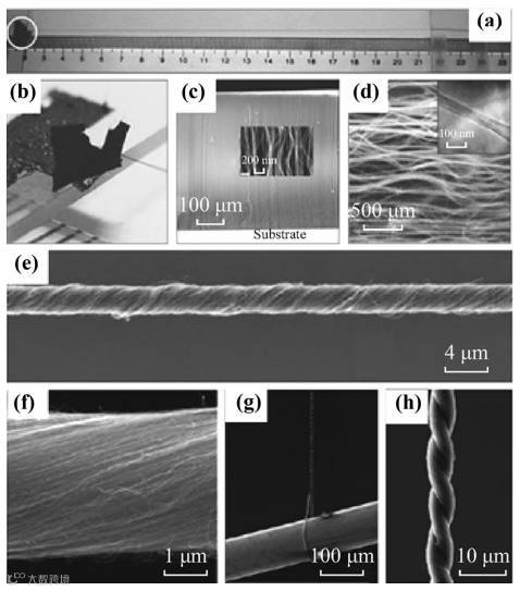 图 5 a) 从独立碳纳米管阵列中拉出的单个CF , b) 碳纳米管阵列的放大图像, c)碳纳米管阵列的SEM图像,d) a)中纱线的扫描电镜图像(插图是一个单线程的CFS的TEM图像),e) CF的低倍SEM图像,f) CF的高倍SEM图像,g)CF在镍丝周围形成一个环,然后扭曲, h)双捻光纤的SEM图像。