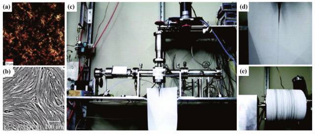 图 2 a) 偏光显微镜观察的分散在123%硫酸中的单壁碳纳米管,b) 碳纳米管a -1/2方向的场发射扫描电子显微镜(FEGSEM)图像,c)混炼和挤出整齐的单壁碳纳米管纤维的仪器设备,d)从毛细管中挤出的单壁碳纳米管液体流, e)一个30米长的水固化单壁碳纳米管纤维卷轴。