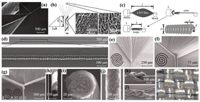 图 7 a) 2mm厚的碳纳米管薄膜制成的200nm厚CF的SEM图像,b) 左边示意图说明了加捻过程对薄膜延伸率的影响,右边分别为薄膜的无应变和应变部分的SEM图像,c) 弹簧状CNT的纺纱工艺图解,d) 一个4.4mm长的、高度一致的、完全排列的绳索的SEM图像,e) Fermat型卷轴的SEM图像,f) Archimedean型卷轴的SEM图像,g) 双阿基米德型卷轴的SEM图像,(插图中分别可以说明);h,i) Si3N4NT@MWNT的双卷纱的SEM图,较亮的区域为多壁碳纳米管,j) TiO2@MWNT纱的SEM图,k) 95% LiFePO4@MWNT纱反手结的SEM图,l) 两个88% SiO2@MWNT纱之间的卡里克弯结,m) 缝在芳纶织物上的85% TiO2@MWNT纱的照片。