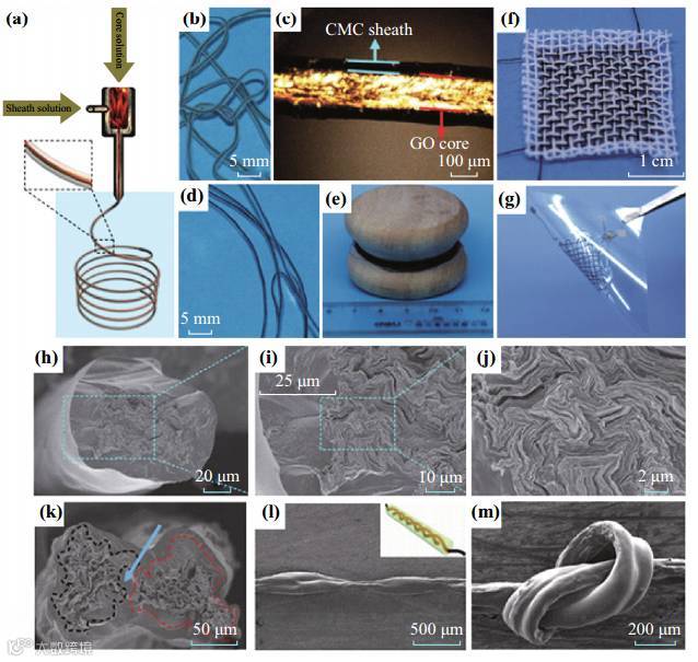 图 12 a)同轴纺纱过程示意图,b) 湿GO@CMC纤维的放大图,d) GO@CMC纤维的放大图,c) 湿GO@CMC纤维的POM图表明核鞘结构和核心中对齐的GO表面,e) RGO@CMC同轴光纤的宏观照片,f) 两种完整的棉纤维同轴纤维,g) 基于两同轴光纤制作的超级电容器装置,h-j) 同轴光纤的扫描电镜图像,k) 横截面扫描电镜图像,l) 一个两层YSC侧视图,m) 一个两层YSC结的扫描电镜图像。