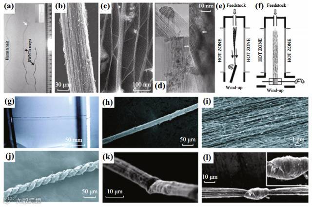 图 6 a) 人的头发和两种生长的单壁碳纳米管纤维的光学图像,b) CF的低放大倍的SEM图像,c) CF的高放大倍的SEM图像,d) 单壁碳纳米管纤维的顶视图的HRTEM图像,e) 主轴对准25的直接纺丝工艺图,f) 炉轴线正常时的直接纺丝工艺图,g) 从主轴(左)到第二个主轴(右)CFS缺口照片,h) 低放大率下的CF的扫描电镜图像,i) 高放大率下的CF的扫描电镜图像,j) 从炉中取出的扭曲的CF,k) CFs弯曲引起的扭结的SEM图像,l) CFs反手结的SEM图像。