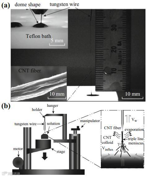 图 4 a )钨丝浸入单壁碳纳米管胶体溶液的光学照片(上插图;刻度栏5毫米);在撤出过程中形成的单壁碳纳米管纤维(主面板;刻度杆10毫米);下部插入SEM图像是在虚线圈中放大的单壁碳纳米管纤维(刻度杆10毫米)b) SWNT纤维的实验装置和形成机理图。