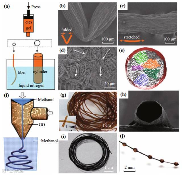 图 11 a) GO多孔纤维的制备方案,f) GO中空纤维的制备方案,b) GPFs折叠的SEM图,c) GPFs拉伸的SEM图,d) GPFs断口形貌的SEM图,e) GPFs的核壳结构模型图,g) 凝固浴中GO-HFs的照片,i) 自然干燥的GO-HFs的照片,h) 自然干燥的GO-HFs的SEM图,j) 链状的GO-HF的照片。