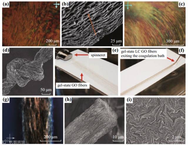 图 9 a) 具有手性相指纹结构的GO水性分散体的POM观察,b,c) GO手性液晶的低温SEM图像和POM织构,d) GF的紧结,e,f) 使用多孔喷丝板生产GO纱线的照片,g) POM观察的凝胶态光纤GO的双折射,h) GO纤维的SEM图,i) GO纤维的放大截面。