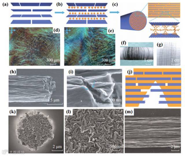 图 13 a-e) LCST策略示意图,f,g) 得到的复合纤维,h,j) GO-HPG纤维的断口形貌,k,i) 拉伸变形机理模型,m) GO-SA纤维的侧视图。