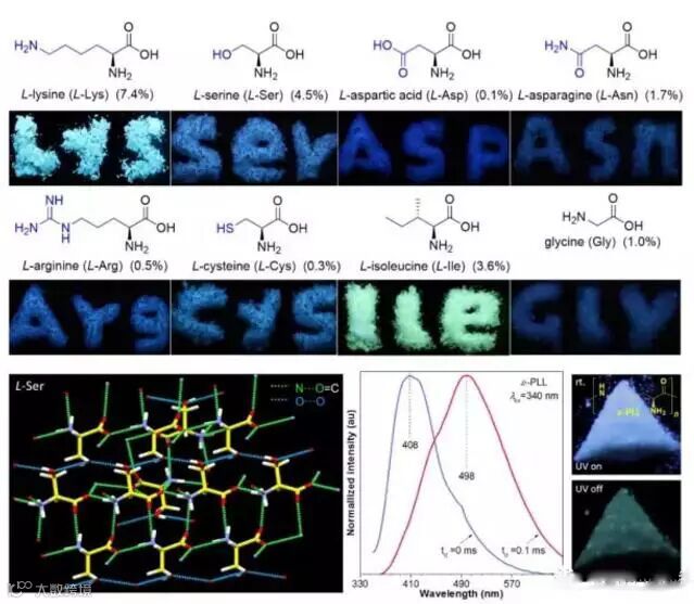 在上述研究基础上,为进一步揭示非芳香性生物分子的发光机理,并探寻生物体系与其他非典型发光体系的关联,张永明、袁望章课题组对构成生物体系的基本单元氨基酸进行了研究。结果表明,含不同侧链基团(NH2、OH和SH等)的所有天然非芳香性氨基酸固体,即便在365 nm紫外光照下,也可以产生可见光发射。以赖氨酸(L-Lys)、异亮氨酸(L-Ile)、丝氨酸(L-Ser)为例,其稀溶液即便在77 K也不发光,而其浓溶液和固体即便在室温也能发光,表现出浓度增强发光和聚集诱导发光(AIE)性质。这些光物理行为与PAN体系性质颇为相似,因此可用CTE机理合理解释。单晶结构分析进一步显示晶体中除H···O=C、H···O–H等氢键外,还存在大量O···O、C=O···N、O=C···C=O 及 O=C···O=C等分子间相互作用形成的3D空间电子相互通道(through space electronic communication channel)。考虑到非氢键体系的类似发光行为,作者认为这些非芳香性氨基酸的发光是由后面的电子相互作用造成的,而氢键能促进这些相互作用的形成,并能进一步使分子构象刚硬化,从而有利于发光。