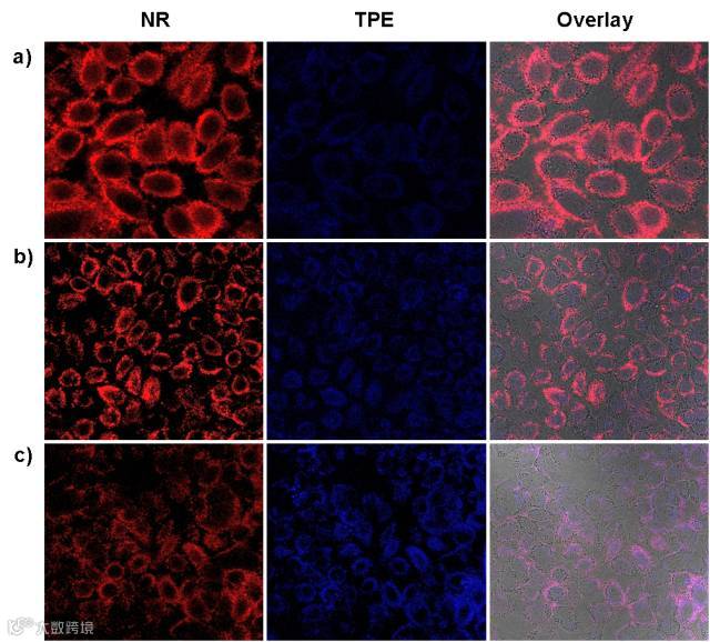 借助TPE在共轭螺旋链上的这一特性,近期,该课题组设计了一种新的共价键链接TPE基团的全共轭聚合物胶束。该胶束不仅具有快速穿透细胞膜的特性,当在该胶束内进一步增溶环境敏感型生色团尼罗红(NR),便形成了最终具有肿瘤微环境响应荧光比率型细胞成像试剂,结构式如图2a所示。该组装体在DTT触发下,其内部的二硫键会发生解离,从而伴随着TPE分子由聚集到分散,以及NR分子从胶束内部向外部的释放过程。该过程导致TPE的蓝色荧光逐渐增强,NR的红色荧光逐渐减弱,从而其混合色也表现出由红到紫的变化,如图2b、2c所示。