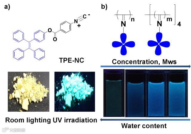 图1. (a)TPE官能化的共轭单体的化学结构式及其AIE发光性质。(b)TPE修饰的共轭螺旋高分子链在聚集态下TPE的ACQ现象。