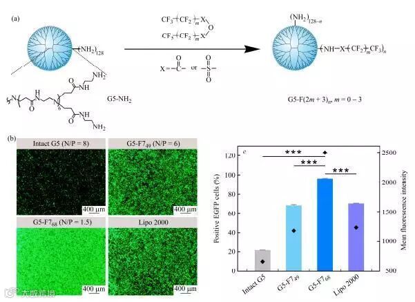 (2)含氟功能基团间的亲氟效应有助于稳定高分子/核酸复合物,从而在极低的氮磷比条件下实现高效转染(图1、图2).