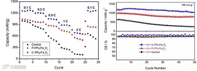 德克萨斯大学奥斯汀分校团队设计开发的基于导电高分子凝胶的新型锂离子电池粘合剂很好地解决了上述问题。他们采用多官能团分子(植酸、酞菁铜等)作为交联剂,将导电高分子(聚吡咯)在电极材料分散液中原位聚合并且交联,形成拥有3D网络结构的电池电极。该凝胶粘合剂在电极中构建了一个拥有高电导率的骨架,将嵌于其中的电极材料互相连接,从而为每一个活性材料颗粒提供高效的导电通路。与此同时,三维结构电极中的多孔结构能促进电解液在电极中流动,从而改善离子的传输。得益于原位聚合,导电高分子凝胶粘合剂能在每一个电极材料颗粒的表面形成高分子薄层,从而避免颗粒的聚集,保证了通往每一个颗粒的电子离子传输。以上这些特性保证了电池电极的优良倍率性能。另外,得益于高分子材料的粘弹性,凝胶骨架能协调电极材料在电化学反应中产生的体积变化,从而保证传输通路的稳定性,提高电极的使用寿命。